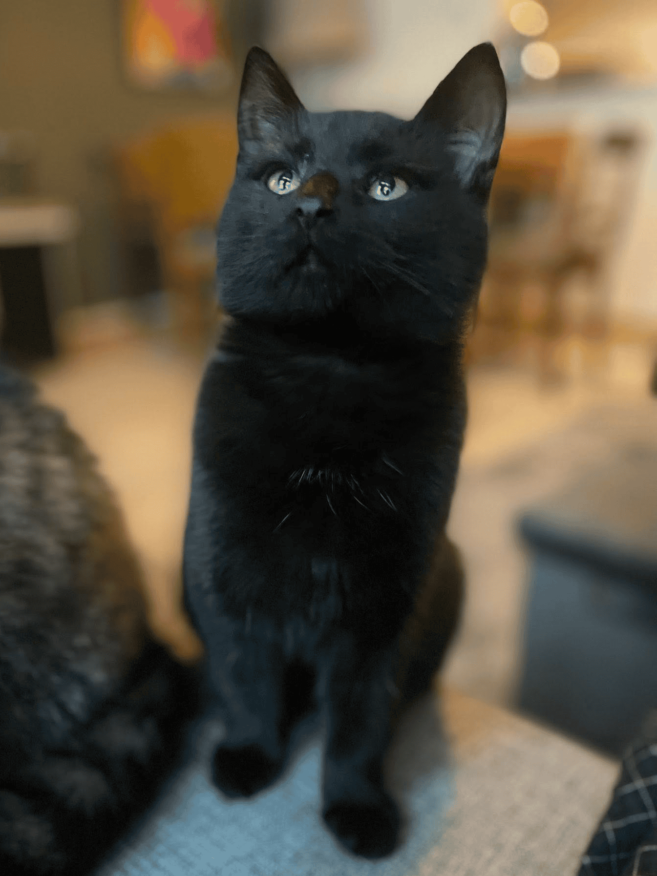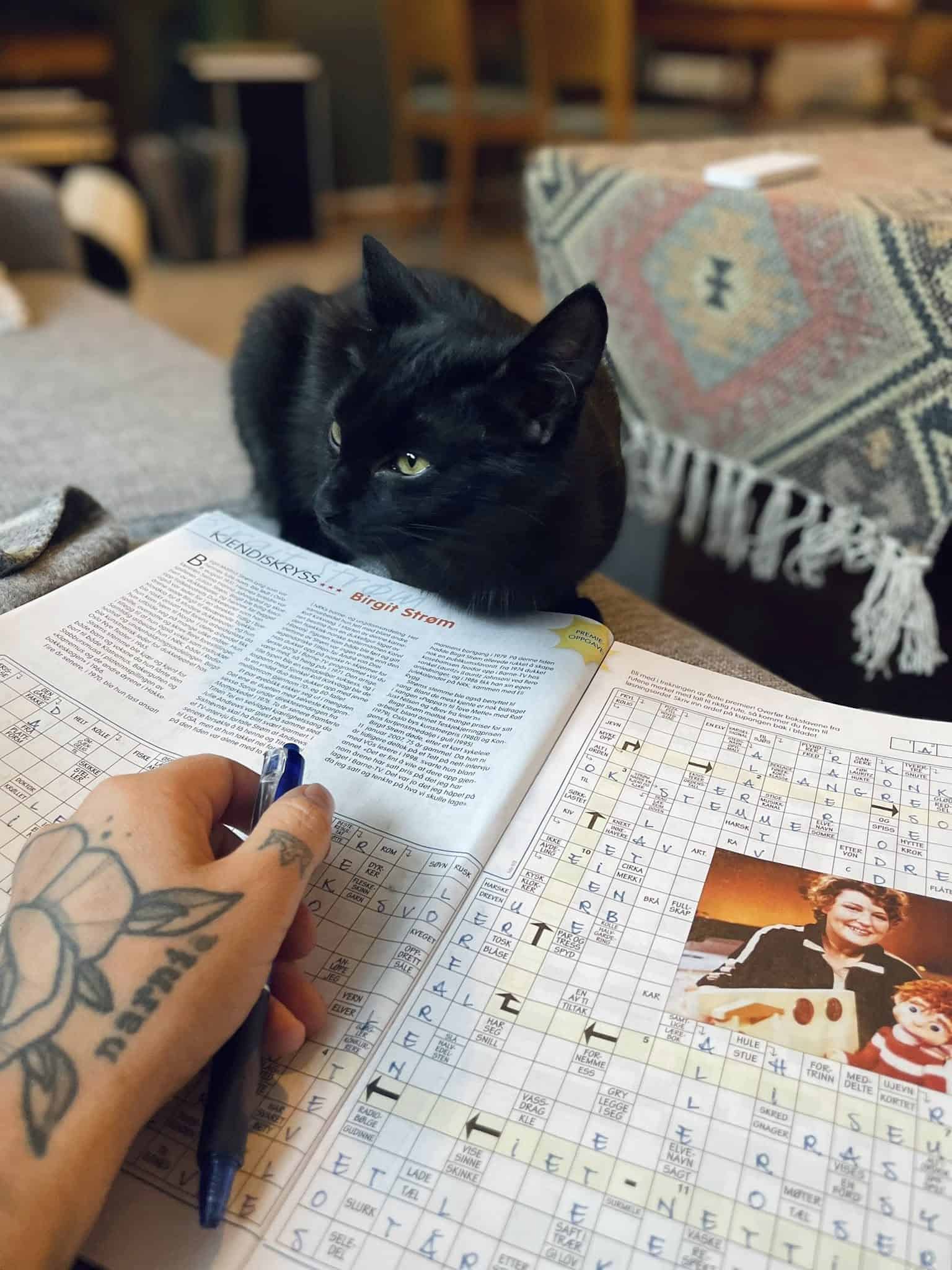 Fie er ei nydelig pusejente med kort sort pels og gule øyne.