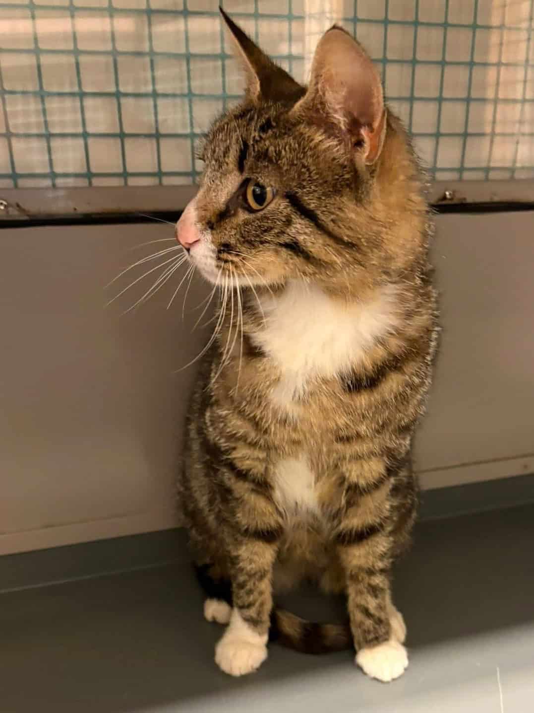 Rosita er en flott hunnkatt med korthåret brunspraglete og hvit pels. Hun har hvit pels rundt munnen og på hake, bryst, mage og føtter. Hun har svart haletipp og en søt rosa nese.