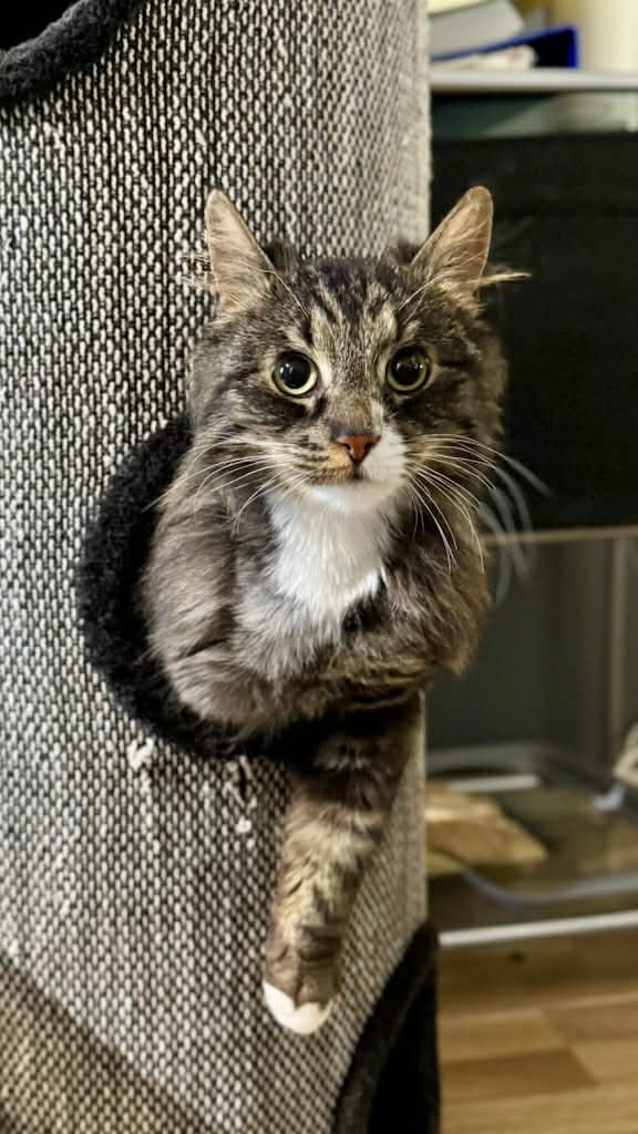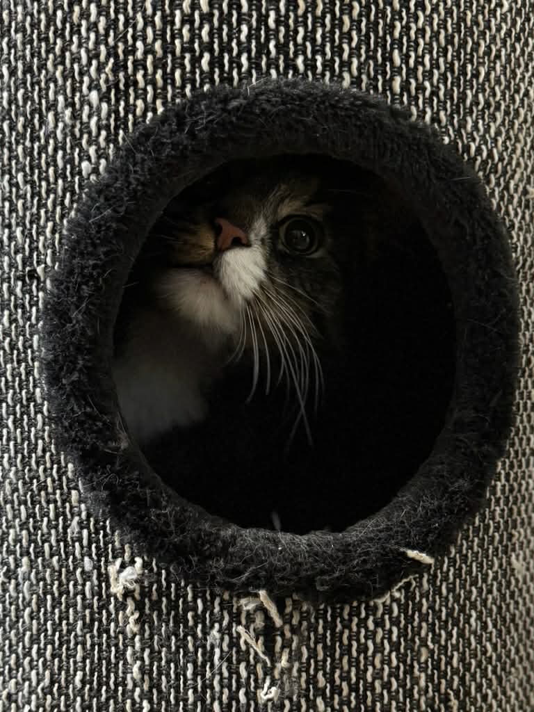 Tøfflus er veldig flink på å bruke kloremøbler, og har ikke rørt sofa eller seng hos fosterhjemmet. Favorittsangen hans er forøvrig «Tøff i Pyjamas» av deLillos.❤️»