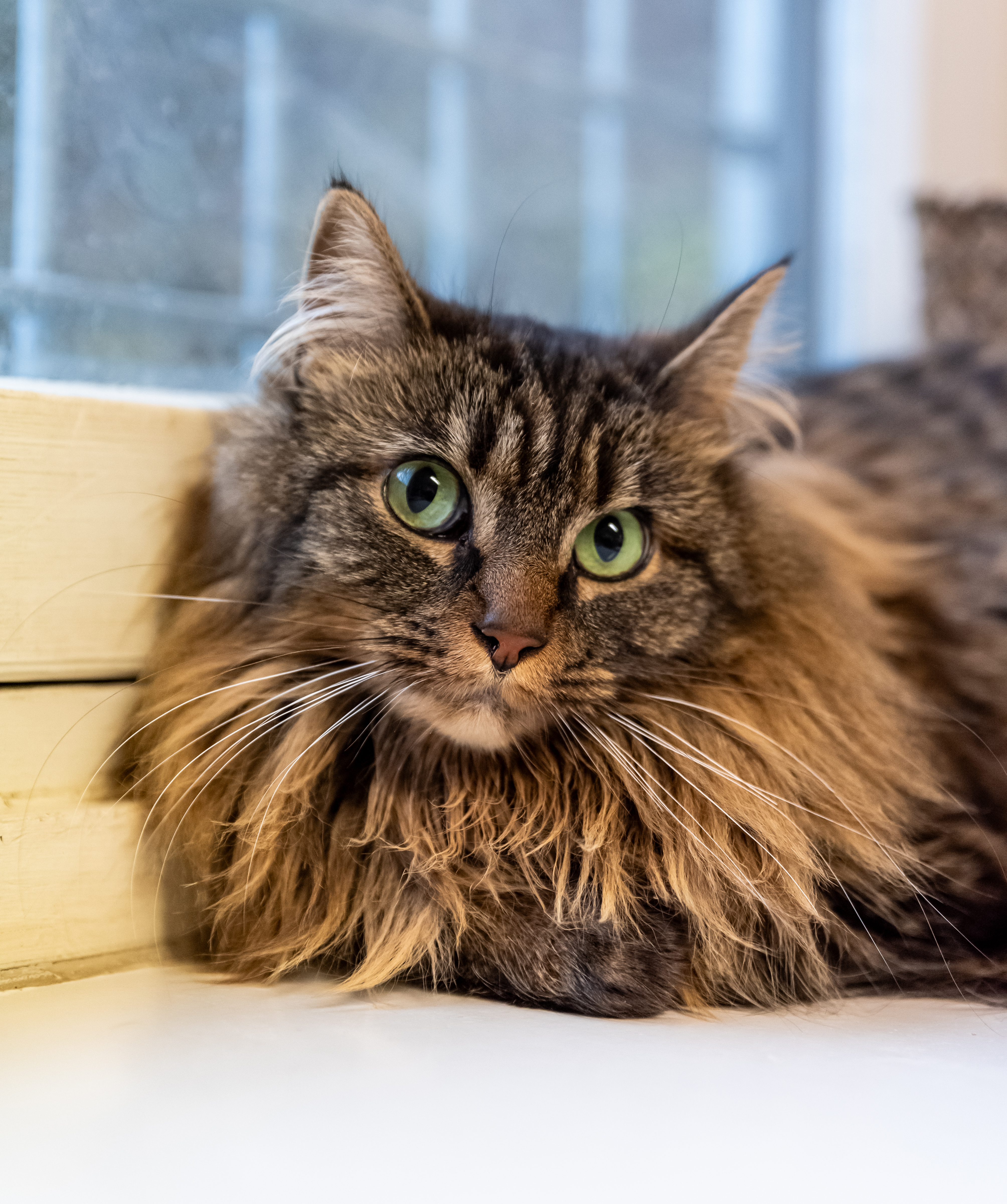 Hils på Violette! Violette kom inn til oss i november 2024. Hun har estimert fødselsdato 01.07.2017, og er en vakker hunnkatt med semilang grå- og hvittigrete (tabby) pels og gulgrønne…