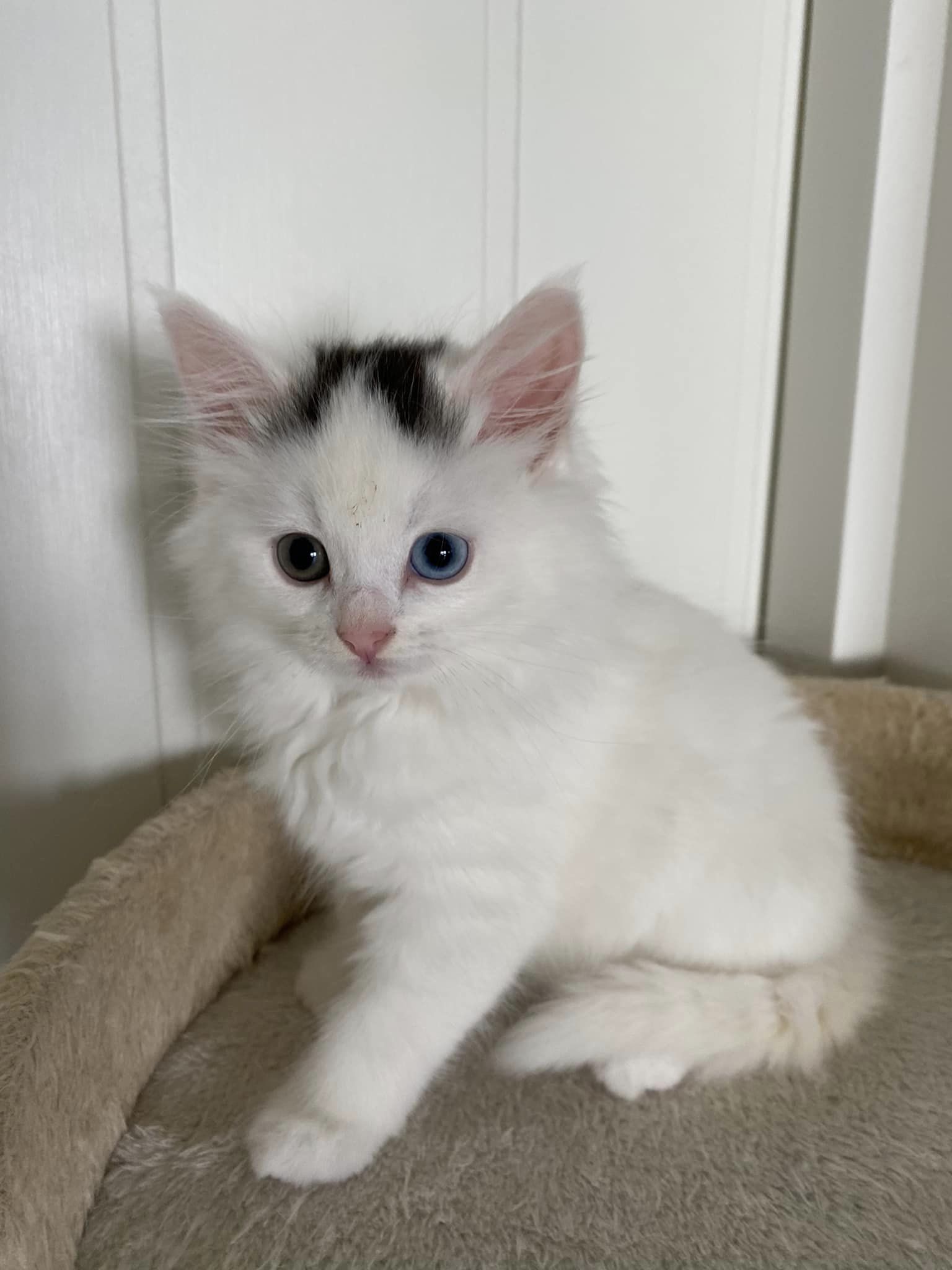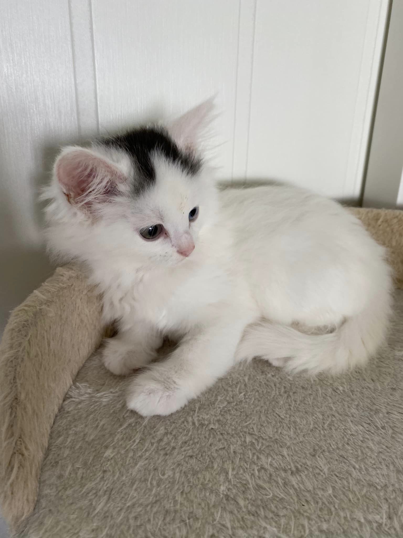 Betsy er en nydelig pusejente med hvit semi-lang pels med en sort flekk på hodet.