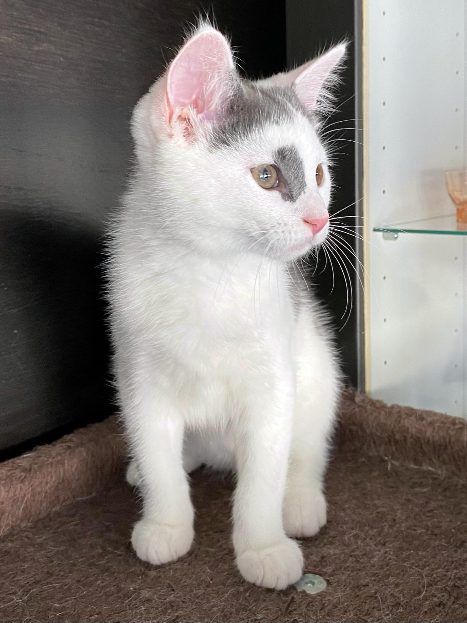 Bettie er en nydelig pusejente med hvit semi-lang pels med grå flekker.