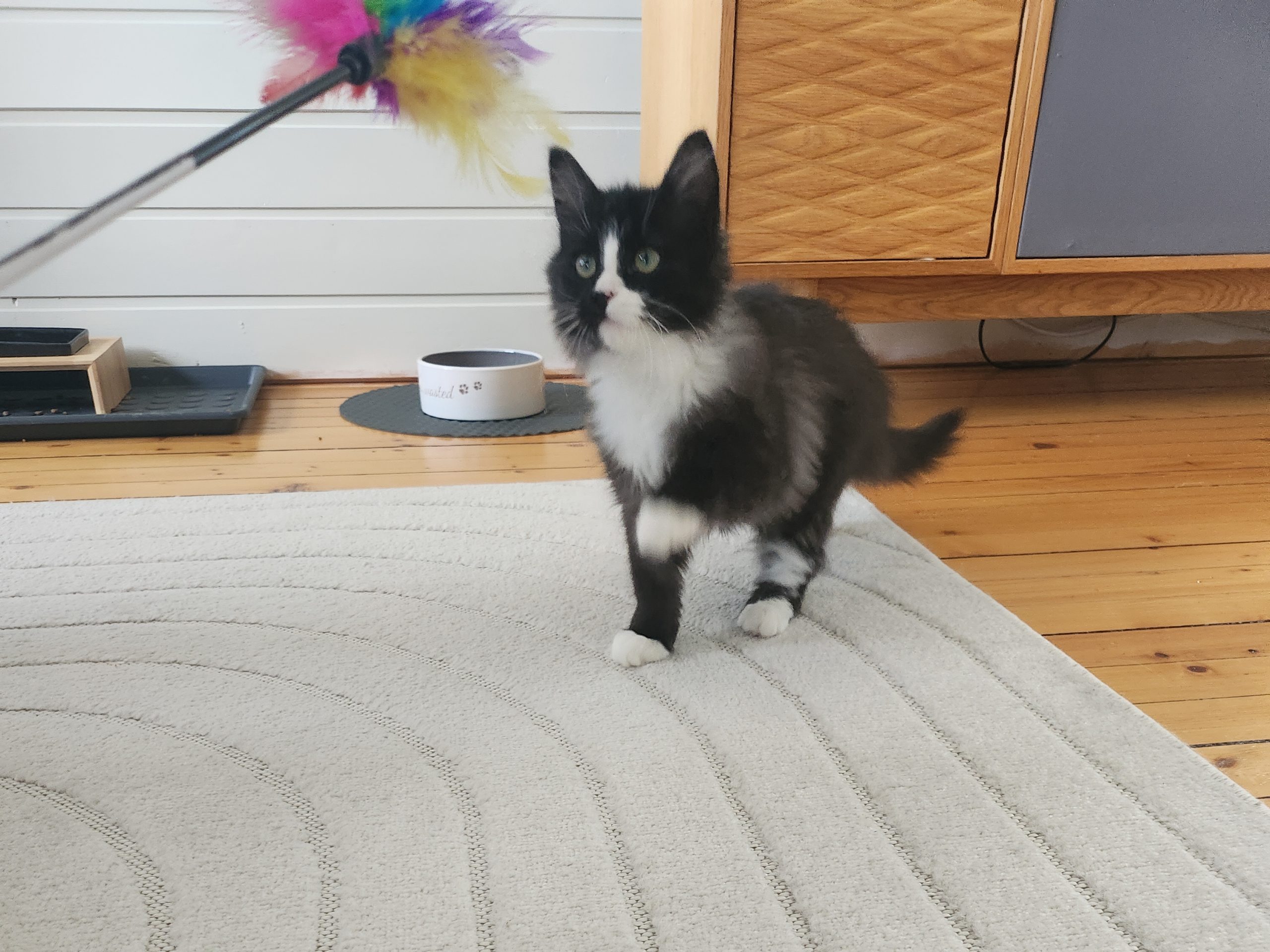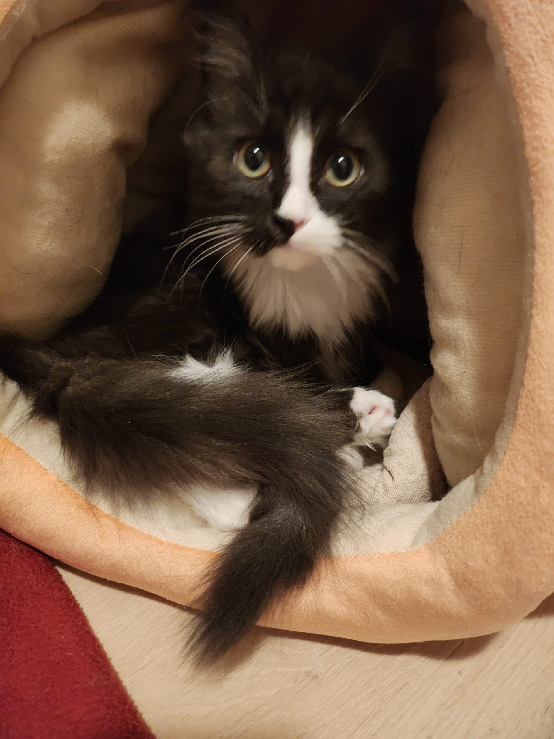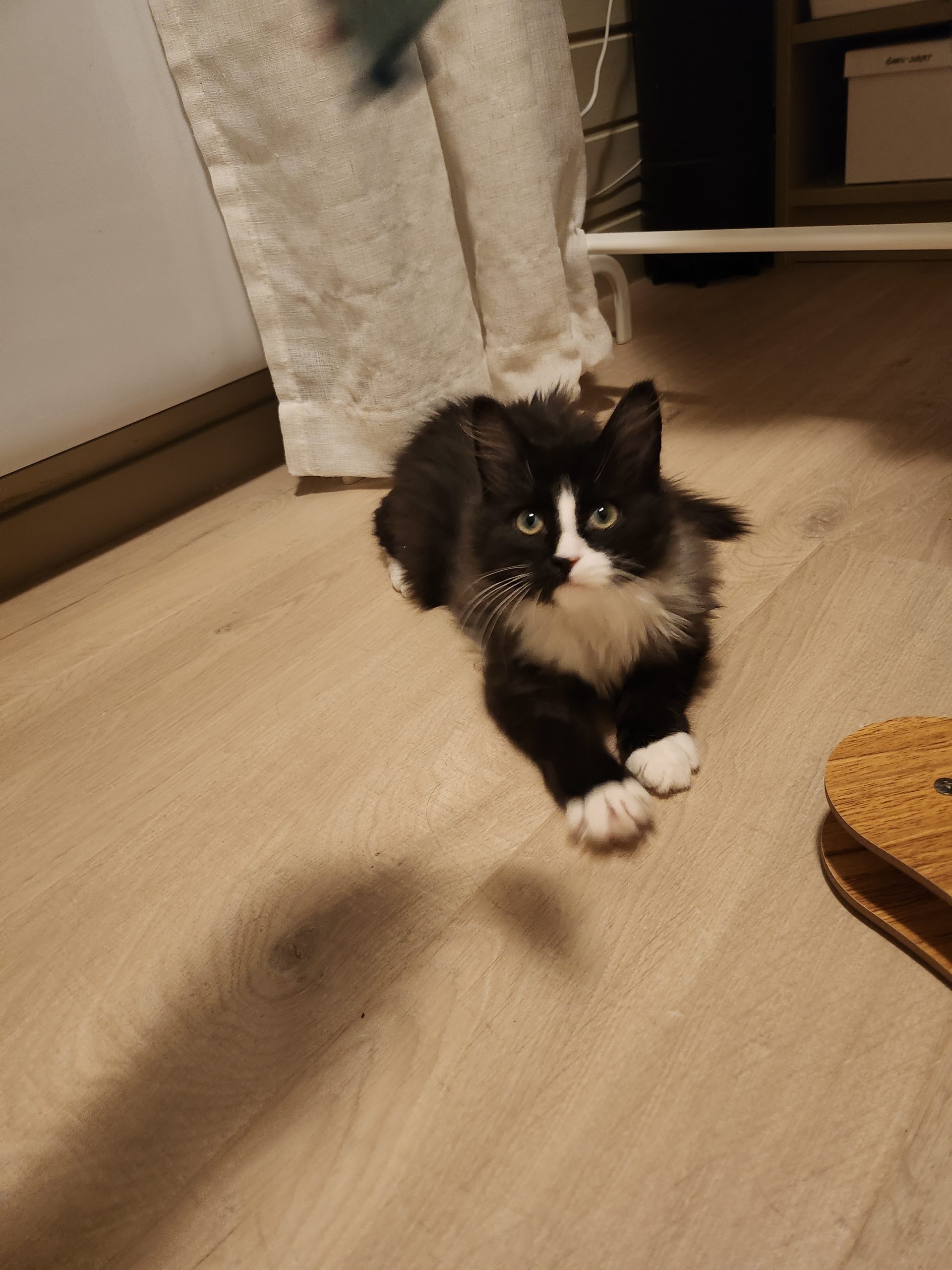 Nilas kom inn til oss i august 2025 fra Frøya, hvor han hadde gått hjemløs ute sammen med moren over tid. Ved inntak var han rundt 4 uker gammel, og han var redd og hadde flokete pels. Han har antatt fødselsdato 01.07.2025.